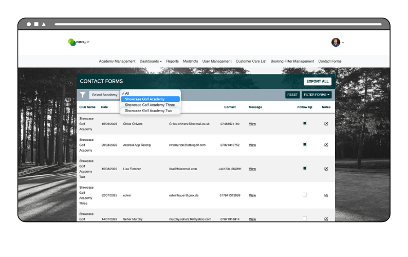We’re excited to announce a powerful new feature in the Owner Space of GLF Connect giving business owners and management users the ability to view and manage contact form submissions across all academies from one place. Owners space users can now access a Contact Form screen via the Contact Form menu navigation.