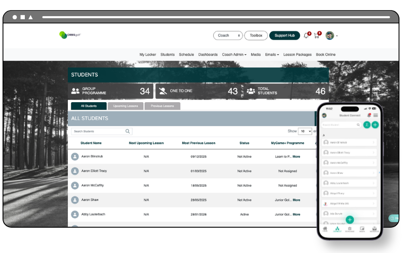 This option reflects the current behaviour of the GLF Connect platform. When selected, coach users will only be able to view students who have had a past or future lesson or class booking with them. This applies to both the Student screen on the web and the Student Connect Search on the mobile app.